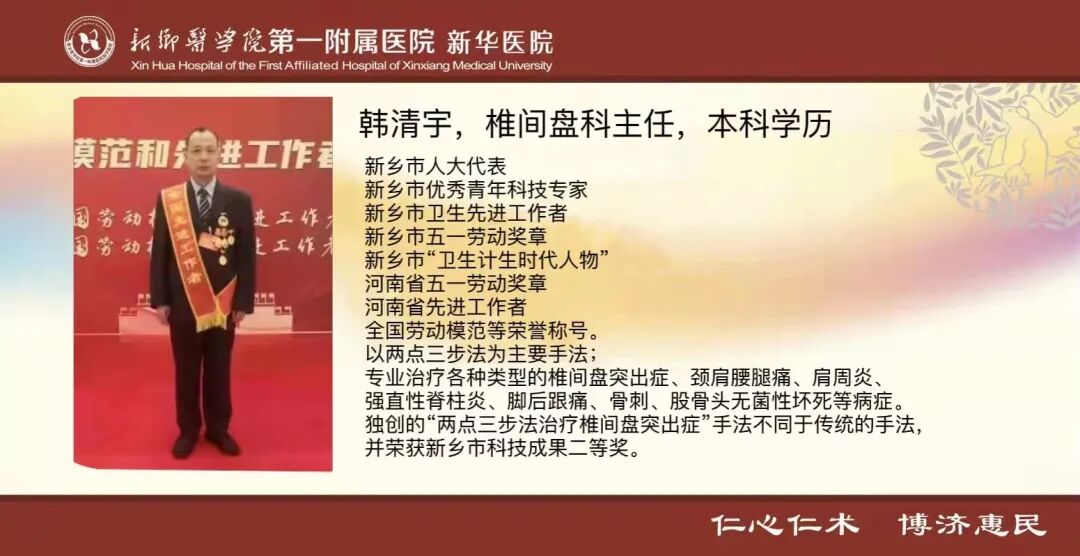 椎间盘科全国劳模韩清宇主任每周一至周五坐诊并进行治疗和随访;